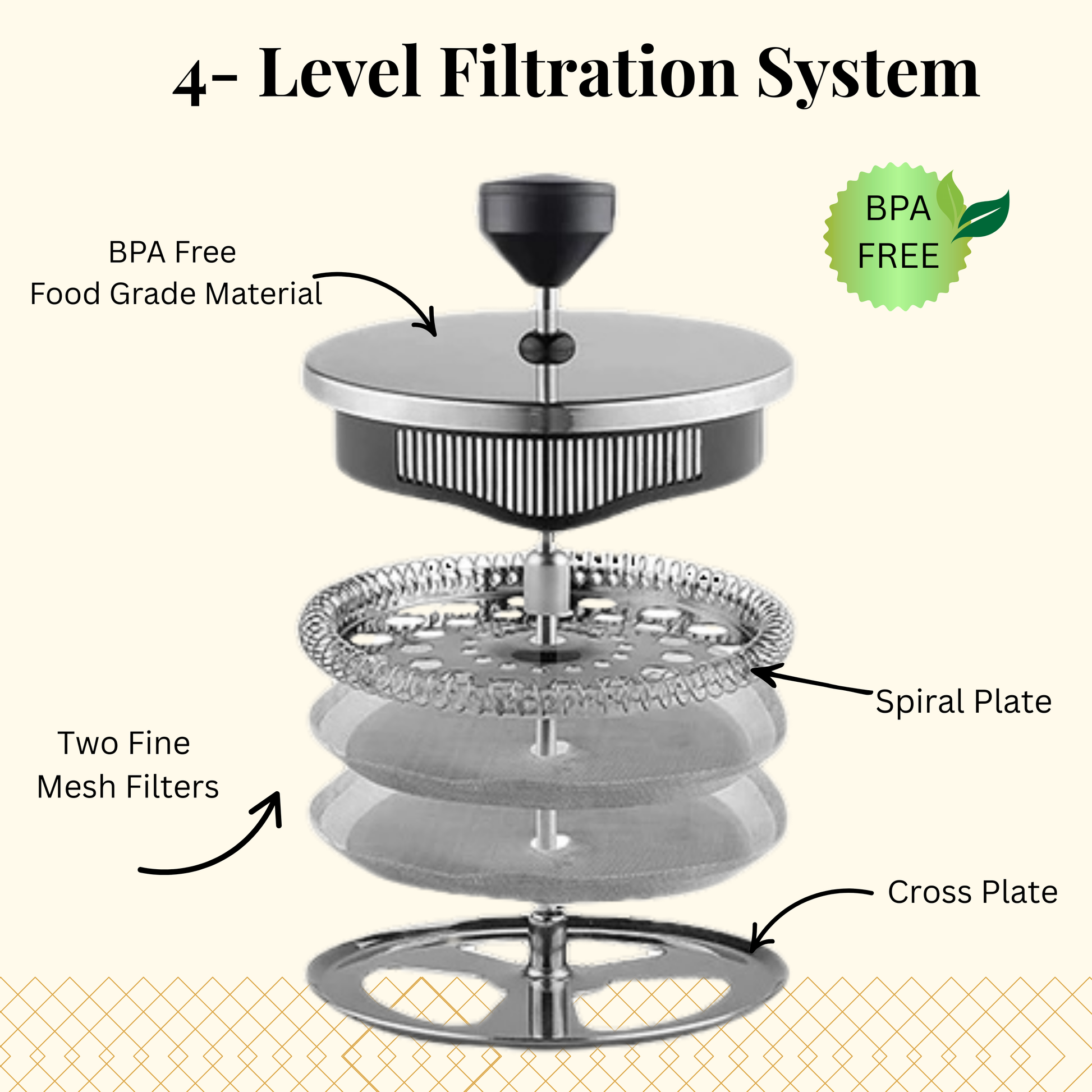 Our French Press is crafted with heat-resistant borosilicate glass and a stainlesssteel plunger and filter assembly for durability, flavour purity, and easy cleaning.