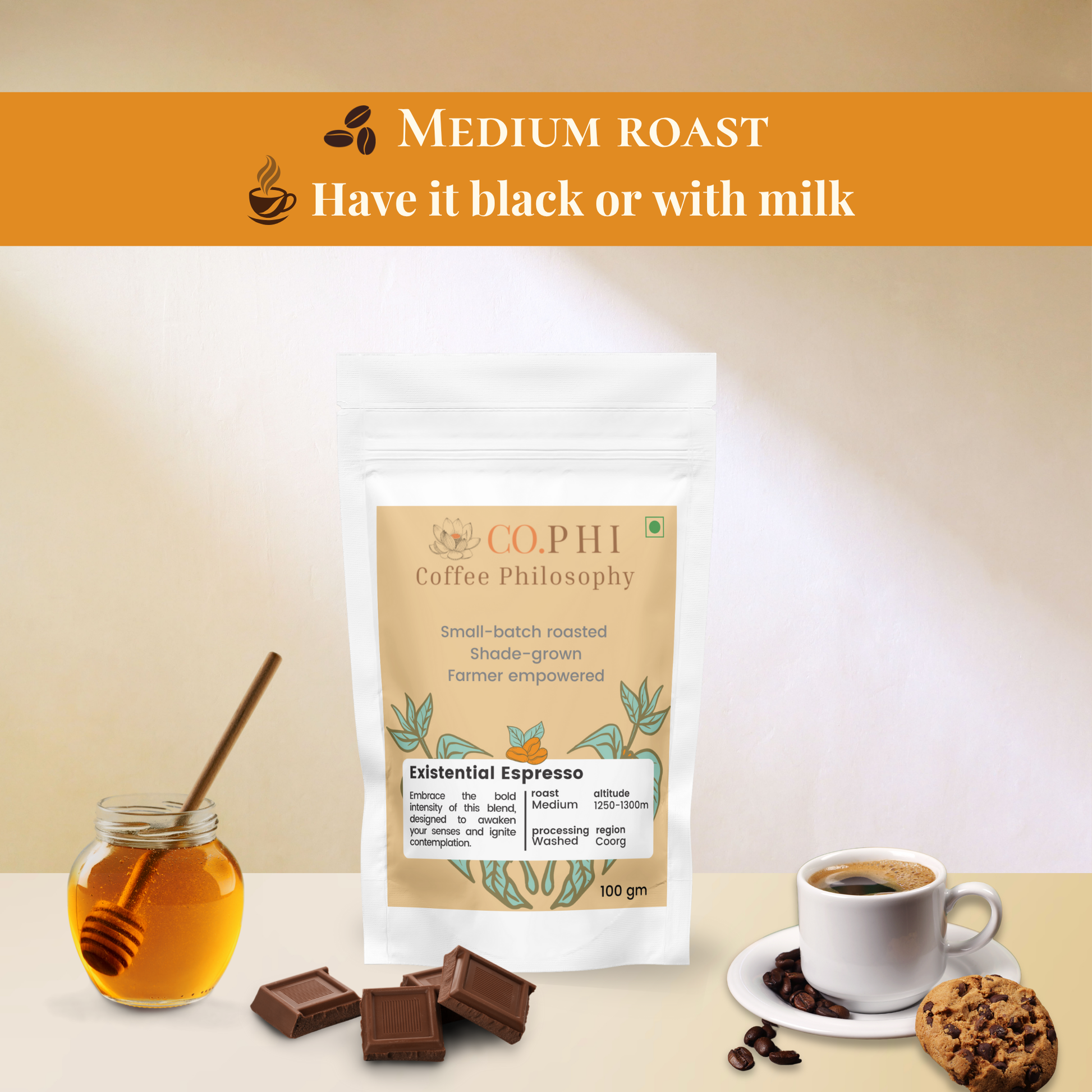 "Existential Espresso" embodies the philosophical balance of being, blending Arabica's floral and fruit aromas with Robusta's rich body and creamy texture. This ideal combination represents a balance of sophisticated flavors and robust strength, offering a versatile and deeply satisfying coffee experience.