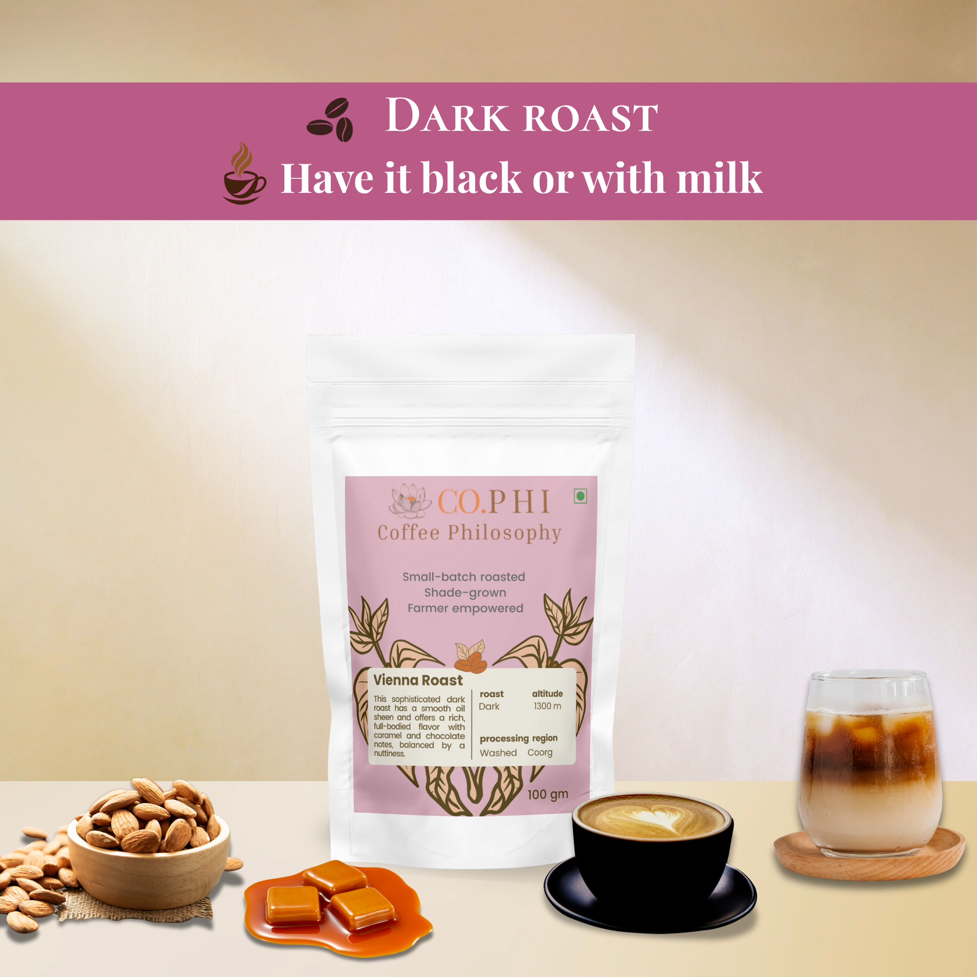 Vienna Roast coffee symbolizes the art of transformation, where the beans' journey through longer roasting melds subtle dark chocolate notes with a smoky aroma. It reflects a philosophical balance between preserving the essence and embracing the evolution of flavor.
