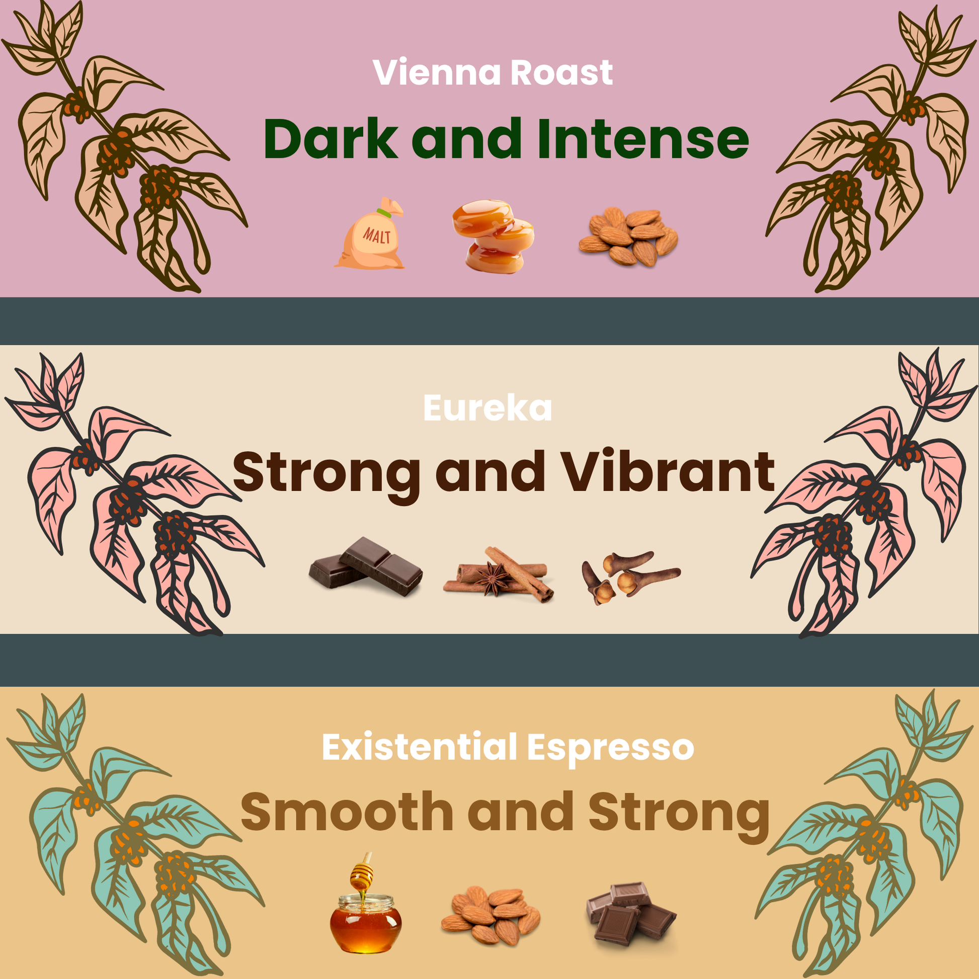 Bold, deep, and unmistakably grounded — the Origin Series brings together Vienna Roast, Existential Espresso, and Eureka. This trio of medium to dark roasts offers layered richness, from smoky and spiced to mellow and bold. Each blend reflects the philosophy of its origins, crafted for those who savour depth and intensity in every cup.