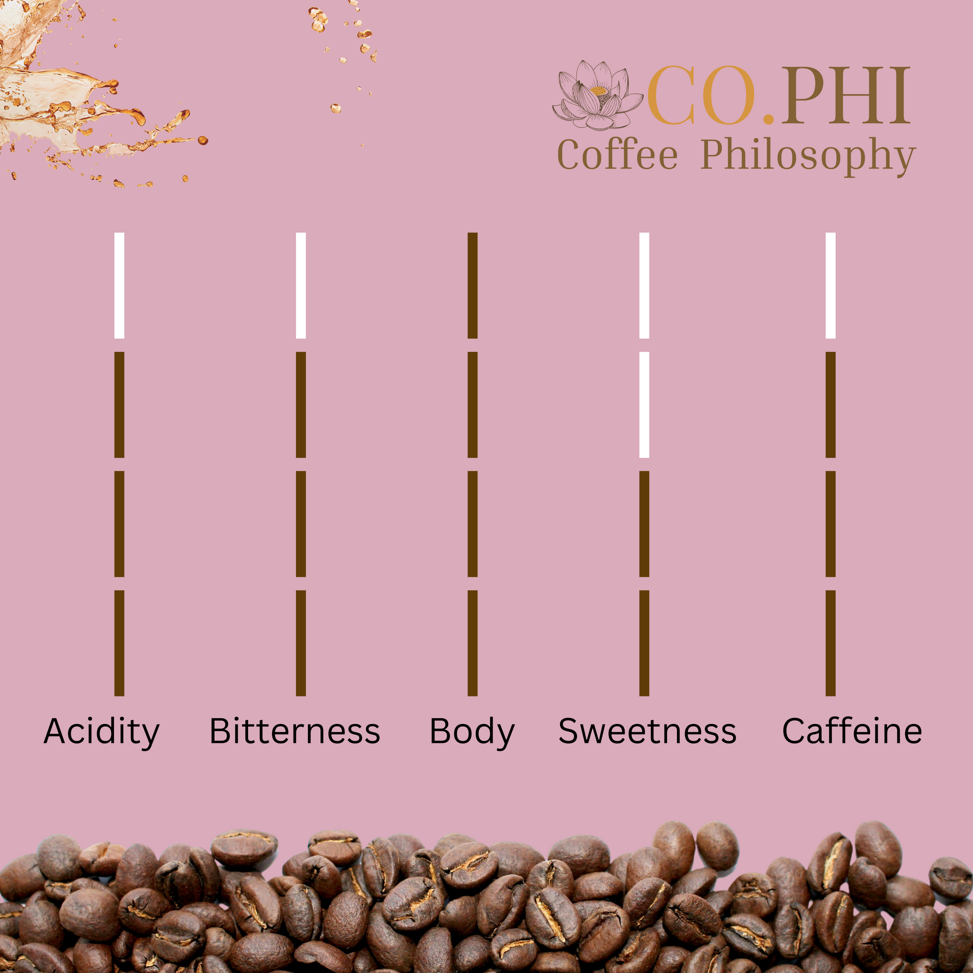 Recommended for espresso-based drinks or for people who like their coffee strong and bold. It is a very richly textured coffee with caramel, dark chocolate and oaky flavour notes and a smoky aroma.