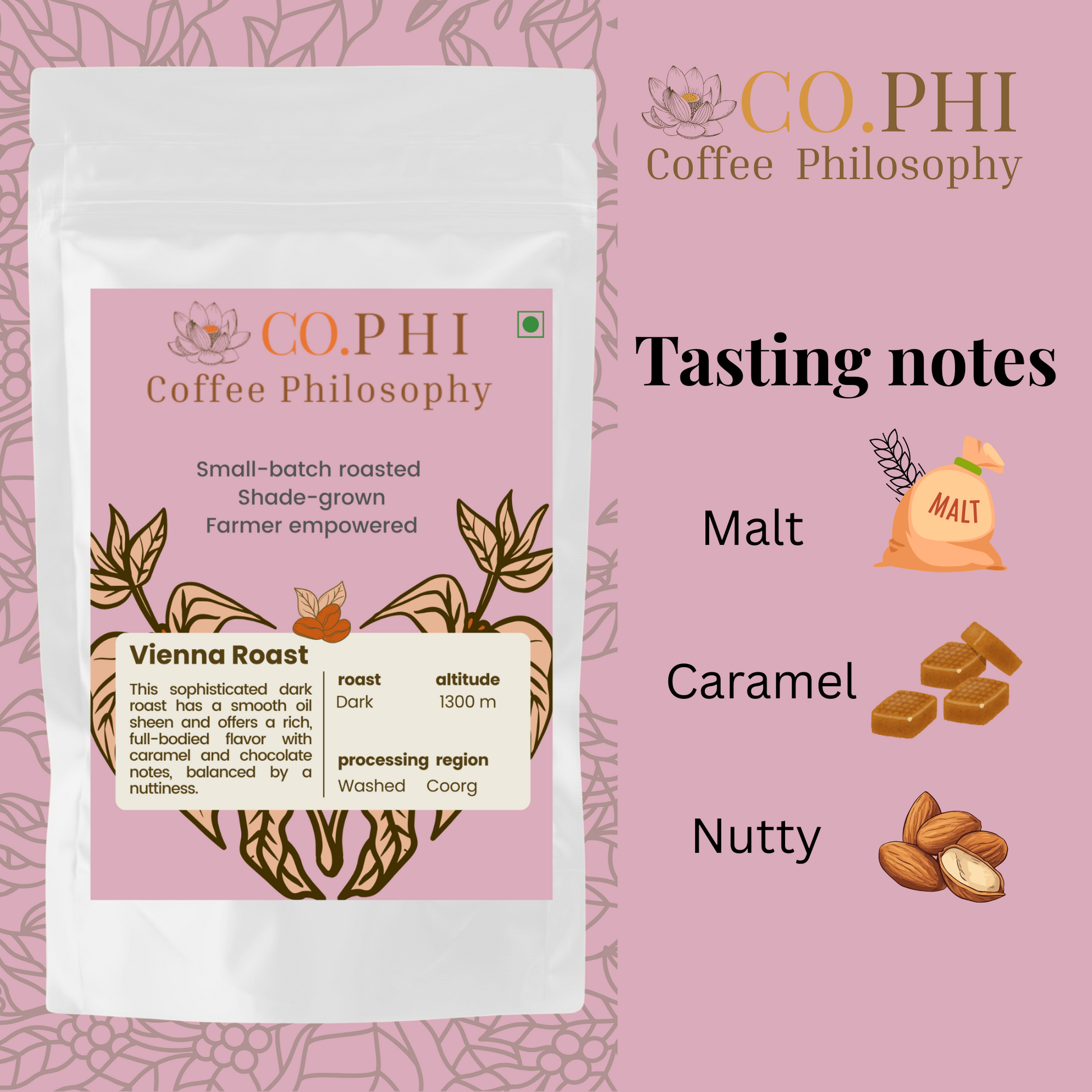 Vienna Roast coffee symbolizes the art of transformation, where the beans' journey through longer roasting melds subtle dark chocolate notes with a smoky aroma. It reflects a philosophical balance between preserving the essence and embracing the evolution of flavor.